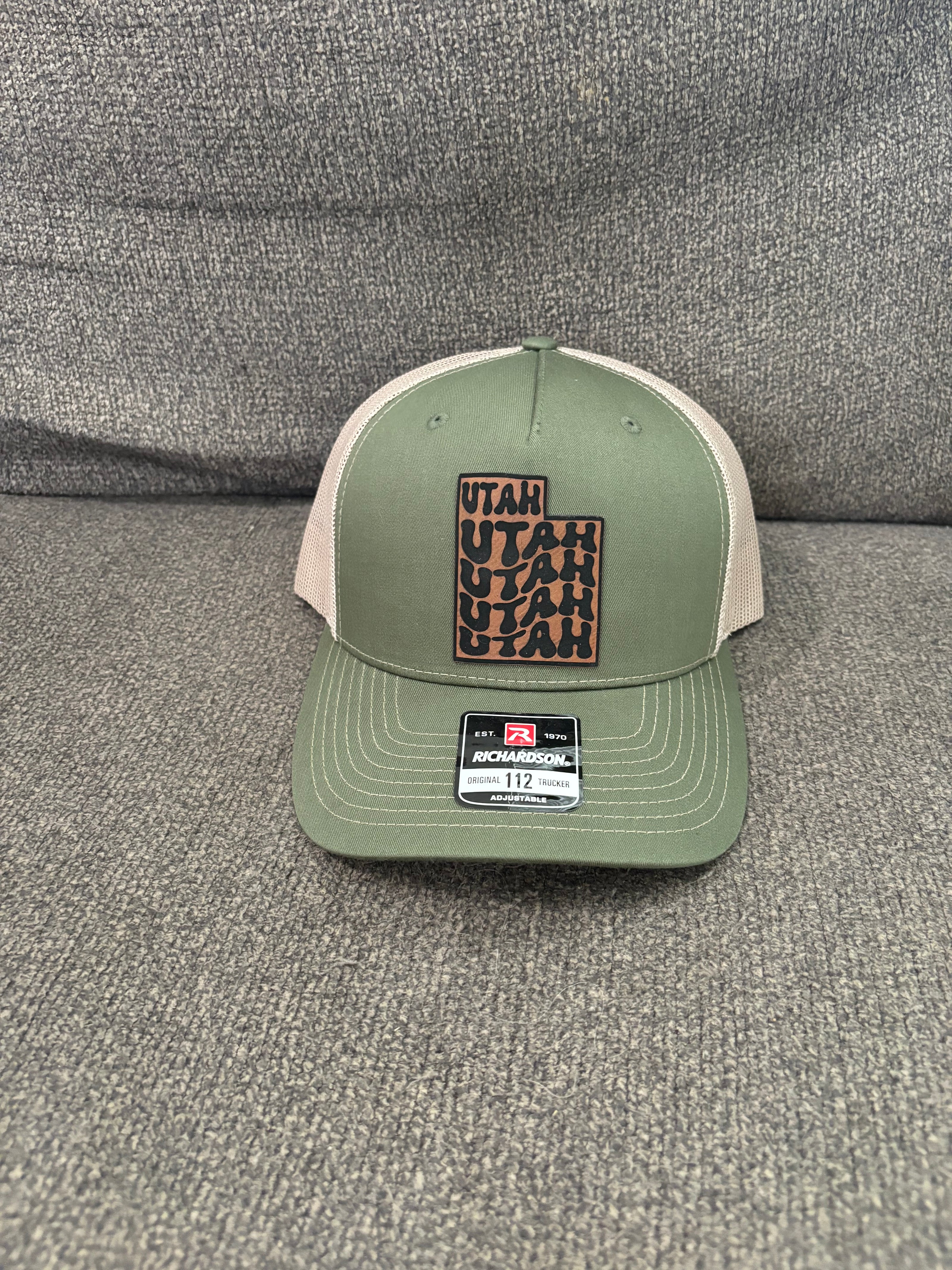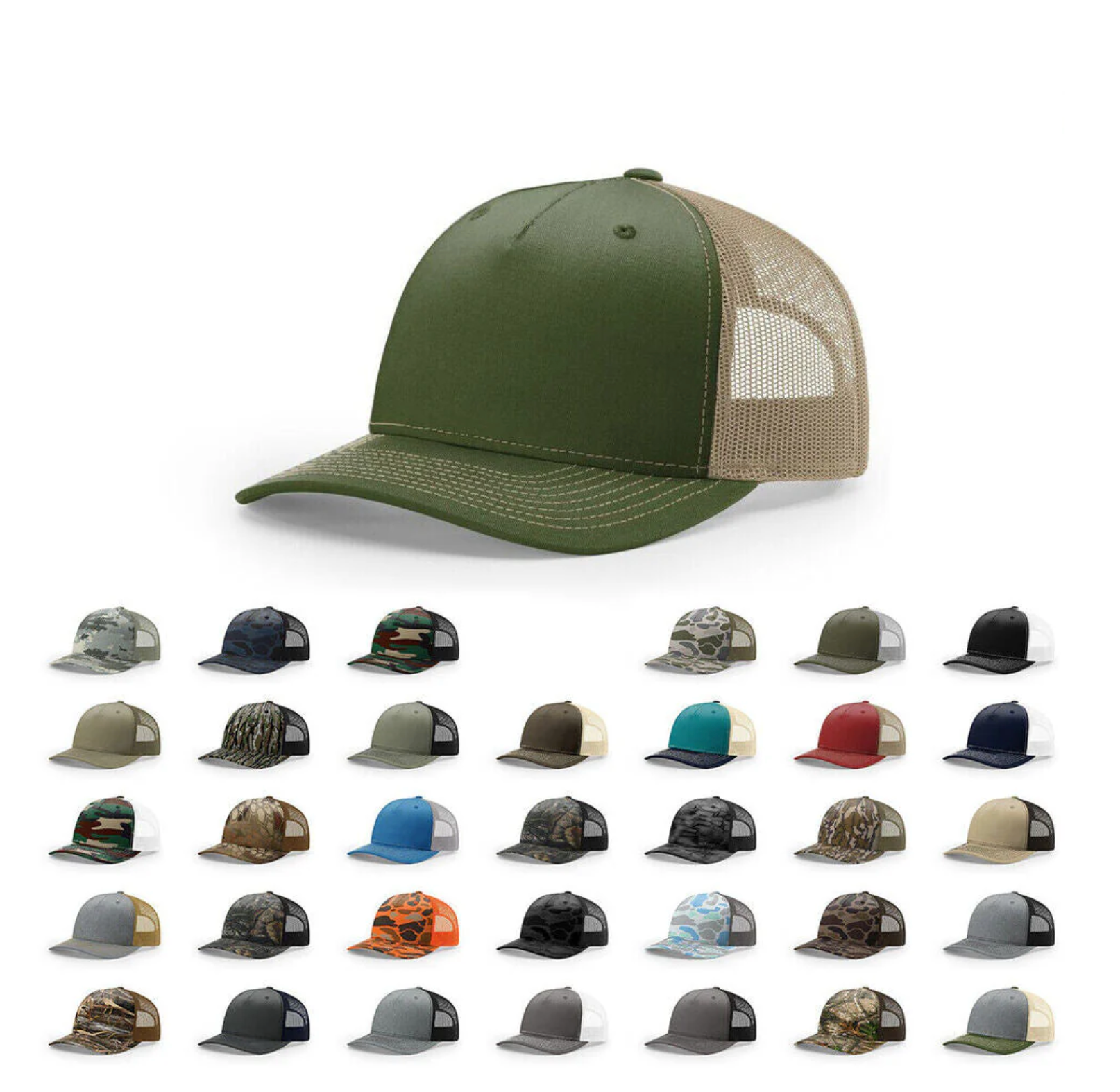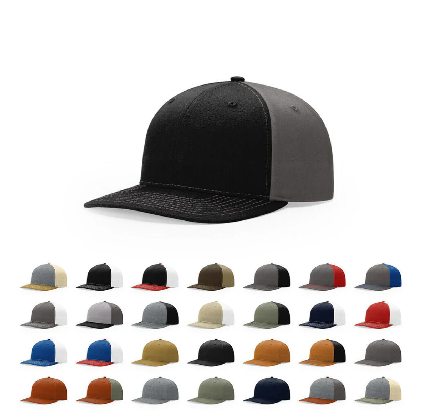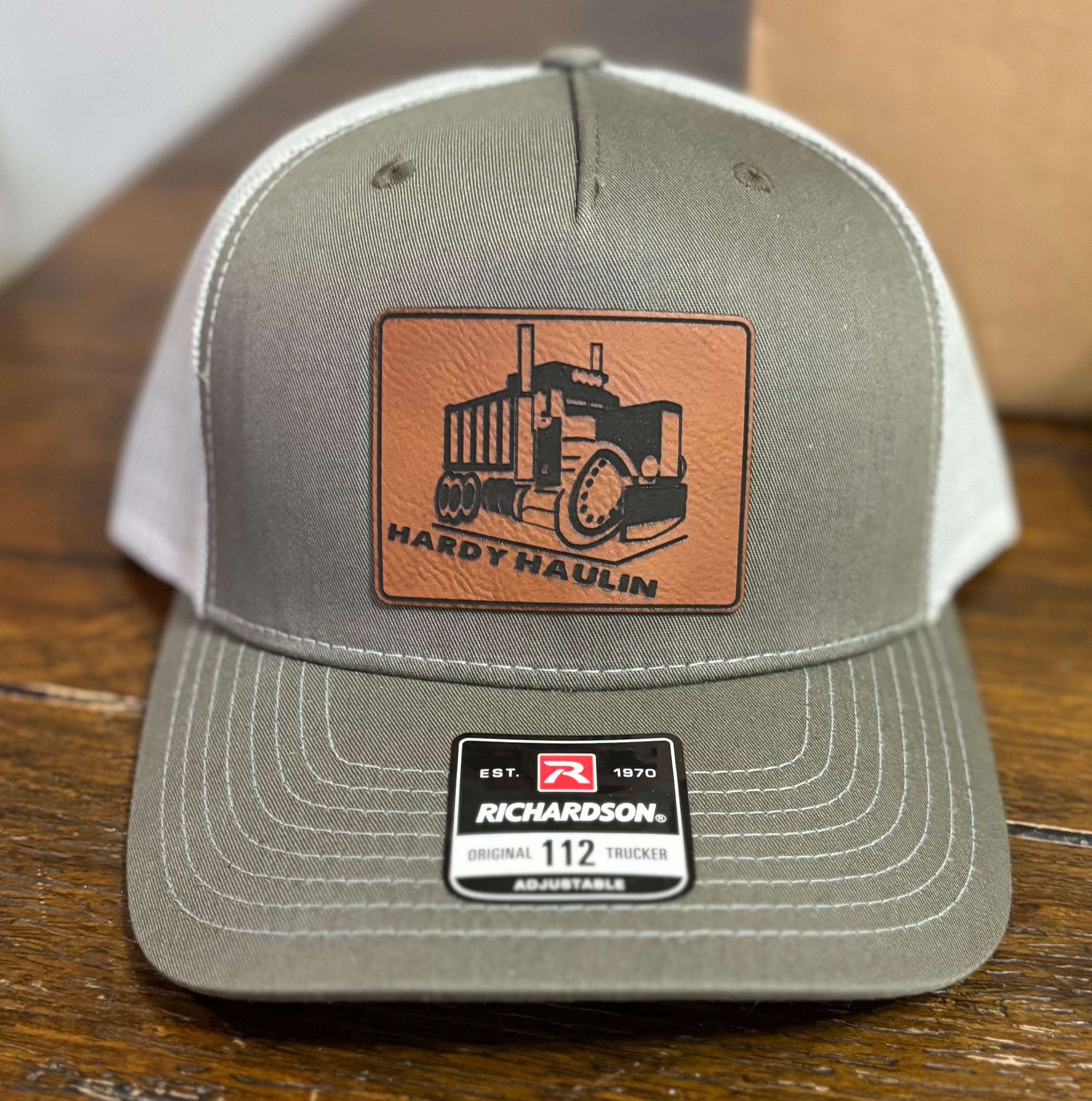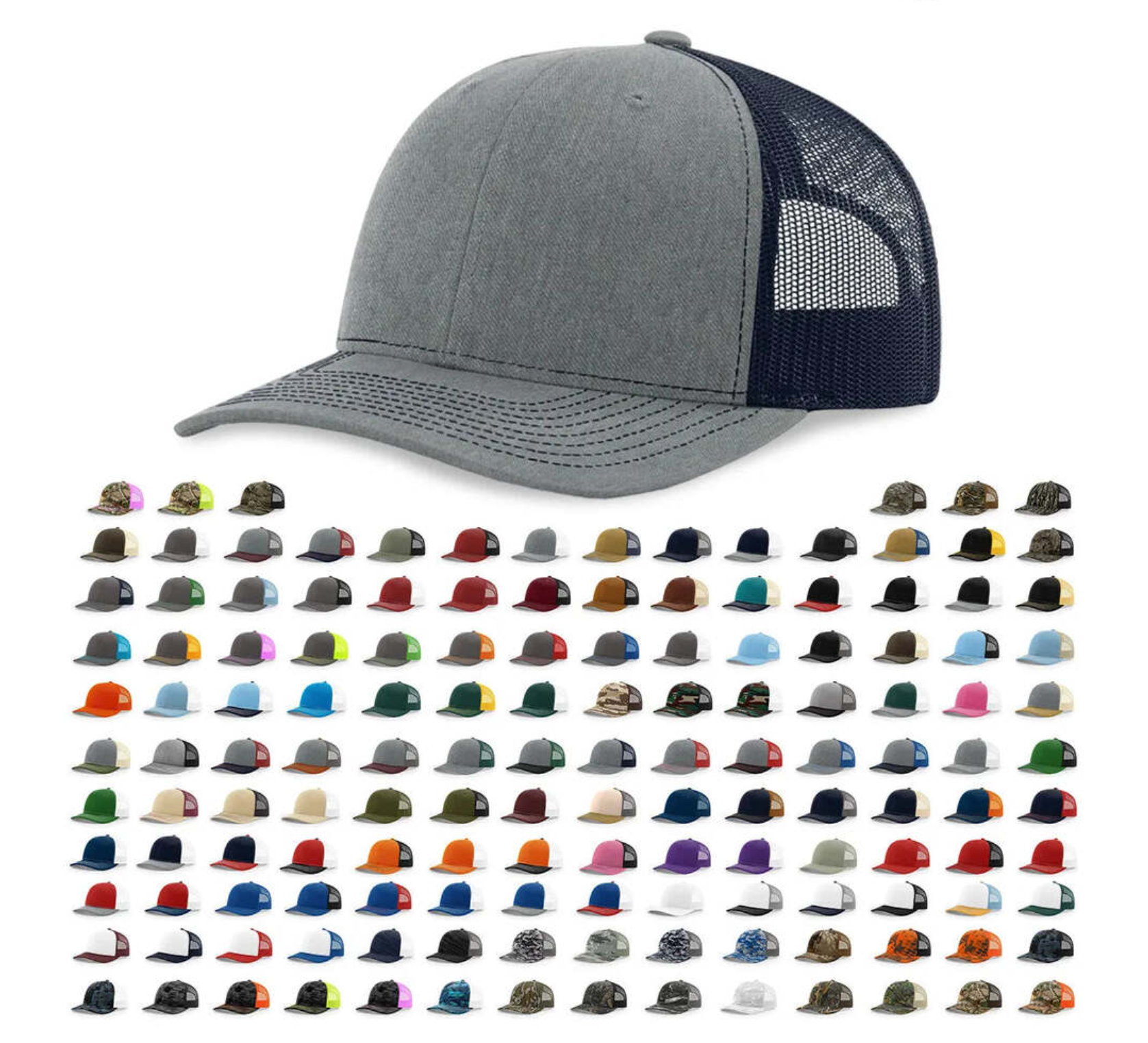 We typically use Richardson 112 hats. They are great quality and come in a variety of styles and colors. If you prefer to use a different brand that is fine. We can order those as well. We use an adhesive leatherette that adheres to the hats with a heat press.